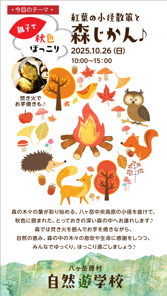 今回は親子で一緒に森の木々の葉が彩り始める、八ヶ岳中央高原の小径を抜けて、